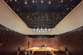 なんといっても圧巻は、真っ黒い天井に無数の小さなスポットライトが、まるで星空のようで幻想的な雰囲気を醸し出しているところですね。舞台天井には、星空から落ちてきたかの様な流星群が、今にも振りそそがんかのよう。星空のホール!ひと目で好きになってしまいました。壁の上部が黒ではなく白いところが、清潔感が溢れていてまたすごいですね