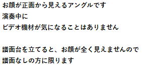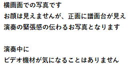 【1日1グループだけの 賀門による撮影時のスペシャルサービス】 私賀門が撮影に行った会場にかぎり、舞台に設置したビデオからの切出し写真(Lサイズ)を、ピアノソロ演奏全員分、連弾のみ出演の方に、無料サービス致します。客席では見れないダイナミックで感動的な、演奏者に寄り添っている目線での一枚となり、大好評を頂いております 同日に2件以上のお客様が被った場合は、どの会場に私が行くかは、MBR側の判断となりますことをご了解下さい。(私が行けなかった会場の、このサービスはありません。。。。ごめんなさい) 舞台カメラは一台のみ設置し、以下の1から4より、お客様が選択できます 1が一番人気ですが、ピアノのすぐ横にビデオカメラを設置するため、演奏者が気になるかもしれません 1.ピアノ裏から(圧倒的人気です) ![]() ビデオ機材はピアノの裏にほぼ隠れる為、ビデオ機材の写真へ映り込みは最小で、 メイン写真にはレンズ部が少しだけ写る程度です ![]() 会場の下手からは、ビデオカメラ自体が少し見えてしまいます ![]() 2.下手の手前から ![]() 3.下手の奥から 4.上手から. ![]() ピアノソロに出演せず、連弾だけ出演された方も、本サービスをご提供します。 歌やバイオリンだけの発表会は、定位置狙いでよろしけれは、本サービスをご提供できます。 ピアノと歌やバイオリンなどの混在するプログラムの場合は、ピアノを狙ってのカメラ設置となるため、歌やバイオリンは撮影できません。 狭い会場や、準備時間の無いスケジュールでは、舞台上にビデオの設置が困難で、このサービスが出来ない場合がありますことをご了解下さい。 また当店の都合により、予告無く本サービス中止の場合もございますことをご了解下さい。(なるべくそうならないように努力します) まずはお問合せ下さい(ここをクリック) |